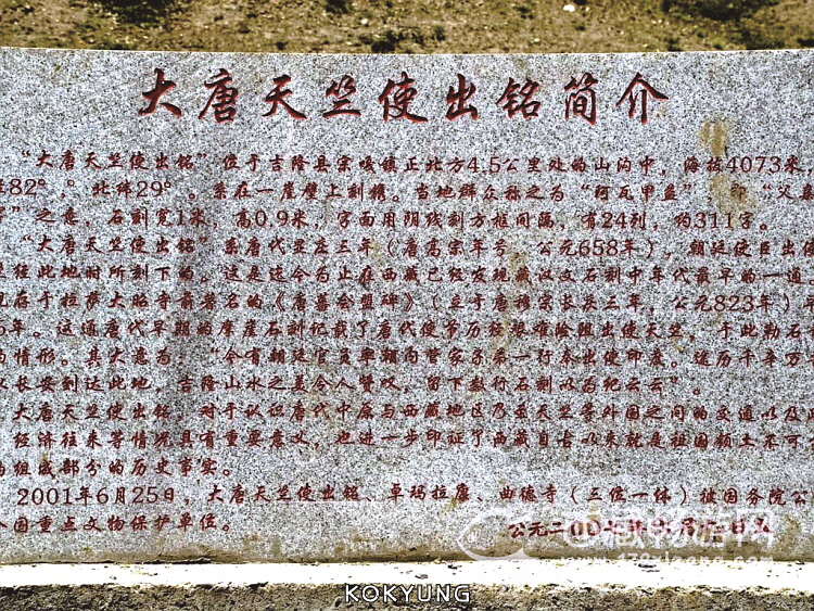 (주3) 이 석각은 케룽현에서 4km 거리에 있는 아와자잉산[阿瓦呷英山] 입구, 해발 4,130m 지점이다. 이 명문은 서북에서 동남향으로 뻗어 있는 절벽 중간에 8m 정도의 자연적인 너럭바위에 새겨져 있는데, 그 가운데에 양각전서체陽刻篆書體로 〈대당천축사출명大唐天竺使出铭〉이라 새겨져 있다.