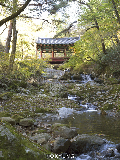길을 따라 계류를 사이에 두고 걷다 보면 석교로 된 반야교般若橋와 해탈교解脫橋를 건너게 된다. 붓다를 만나러 가는 길이 길게 나 있지만, 겸손한 마음으로 걷다 보면 한껏 낮아진 자신이 어느덧 절에 다다른 것을 발견한다. 물소리 들으며 걸어 온 숲길이 끝나는 지점의 계곡에는 반석들이 층을 이루고 있다. 솟아 나온 작은 바위들 사이로 개울물이 흐르고 여기저기 작은 폭포도 만들고 있다.