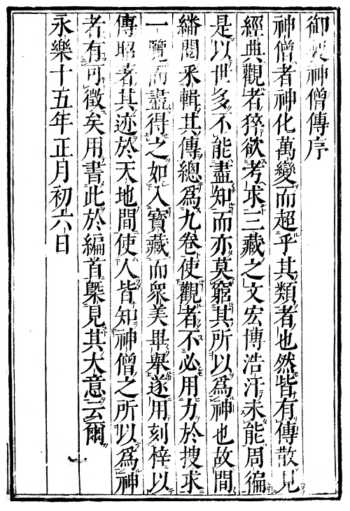 태종 17년(1417)에 원민생 일행이 명나라에 사신으로 가서 처녀 한씨 등을 바치자, 영락제가 『제불보살명칭가곡』 1백 책과 『신승전』 3백 책을 하사해 주었다. 이뿐만이 아니었다. 이듬해 황제의 생일을 축하하기 위해 하성절사賀聖節使로 간 김점은 3백 책을 더 받아왔다.